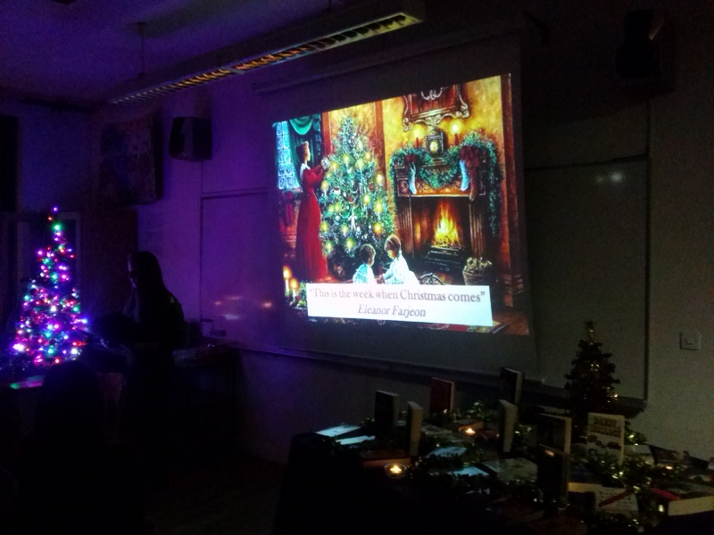 V uvodnem delu smo prisluhnili recitacijam tradicionalnih angleških božičnih pesmi ter interpretacijam odlomkov iz božičnih zgodb. Nato smo vstopili v pravljični svet Božička; v nadaljevanju pa so sledile predstavitve najbolj branih angleških knjig v letu 2014, med katerimi jih je kar lepo število na voljo tudi v naši šolski knjižnici.