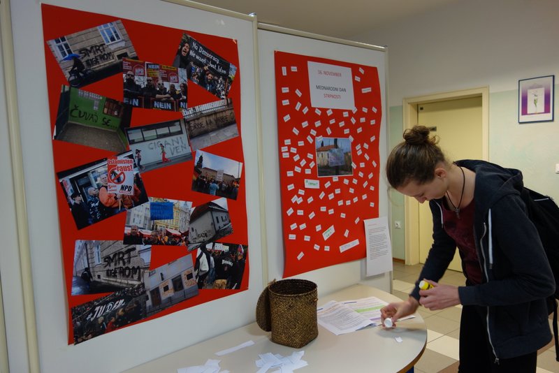 Ob mednarodnem dnevu strpnosti smo na šoli izvedli simbolični izraz naše skupne odločitve za strpnost. Dijaki so z napisi STRPEN SEM, STRPNA SEM oblikovali plakat s sporočilom: »PRVI JE LAHKO SAMO EDEN, ZMAGAMO LAHKO VSI!«. Z akcijo smo želeli povedati, da ni pomembno, kdo je prvi in najpomembnejši član človeške skupnosti, temveč je važno, da znamo sodelovati in delovati skupaj in strpno.