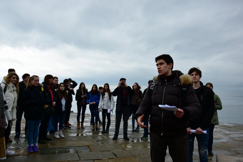Naslednje jutro smo se odpravili proti Liceju Franceta Prešerna v Trstu, kjer smo prvič srečali dijake iz ostalih petih držav, ki so vključene v ta projekt. Na poti v šolo smo si lahko ogledali prečudovit razgled na morje ter Tržaški zaliv. V šoli smo imeli zanimive delavnice npr. »Kako narediti dober selfie?«, spoznavali smo tudi italijanski ter slovenski jezik. Kasneje tega dne so nas italijanski dijaki odpeljali na ogled Trsta. Videli smo ogromno lepih stvari, celotna predstavitev pa je potekala v angleščini. Večer smo preživeli s svojimi gostitelji, ki so nas odpeljali na večerjo v mesto.