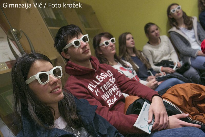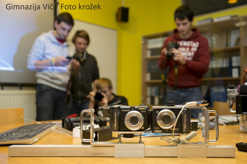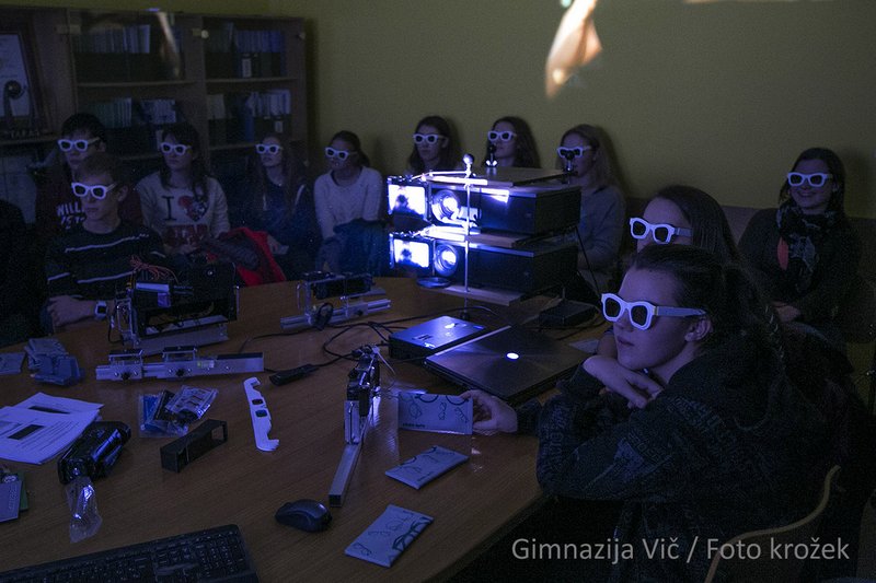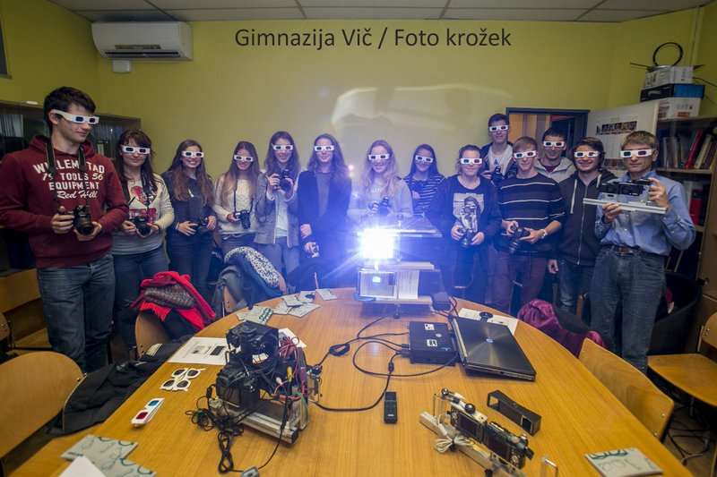 Novembra smo na Gimnaziji Vič začeli s fotografskim krožkom. Že po nekaj tednih fotografske teorije smo odšli na Institut Jožef Stefan spoznavat nadvse zanimivo in relativno staro fotografsko tehniko. Povabilo smo dobili iz Stereoskopskega društva Ljubljana, ki ima redne mesečne sestanke na Inštitutu. Stereoskopijo, bolje poznano kot 3D tehniko, nam je predstavil član društva Damir Vrančič. Spoznali smo kako posneti stereo fotografijo, kako takšno fotografijo opazujemo, ogledali smo si tudi primere fotografij posnetih z navadno in stereoskopsko tehniko in primerjali njihov učinek na dojemanja prostora. Vsak od udeležencev tečaja je v dar prejel stereoskopska očala.