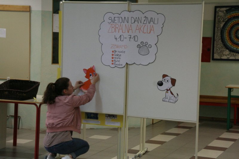 Ob svetovnem dnevu varstva živali, ki je 4. oktobra, so dijake s panojev, sten in omaric prijazno gledali kužki in mucki. Skupaj s plakatom v vhodni avli so opominjali na svoj 'praznik' in dejstvo, da še vedno mnoge živali pristanejo v zavetišču.