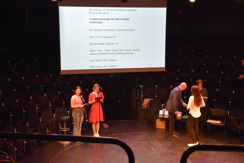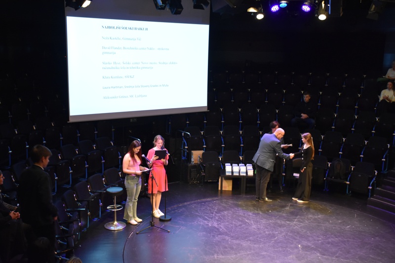 Čestitamo: nagrajenkam in nagrajencem, mentoricam in mentorjem, članicam in članom žirij (dijaki so tekmovali s haikuji v slovenščini, angleščini, španščini in nemščini), nastopajočim.