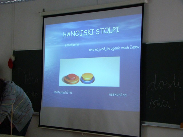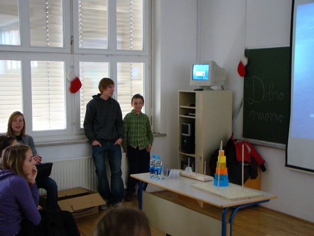 Dva učenca, Samo Kralj in Aljaž Gorjup, sta dijakom naše šole predstavila svojo raziskovalno nalogo o Hanojskih stolpih, s katero sta v šolskem letu 2008/09 dosegla zlato priznanje na tekmovanju mladih raziskovalcev Slovenije.