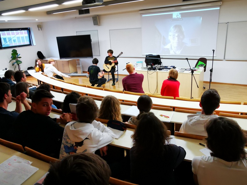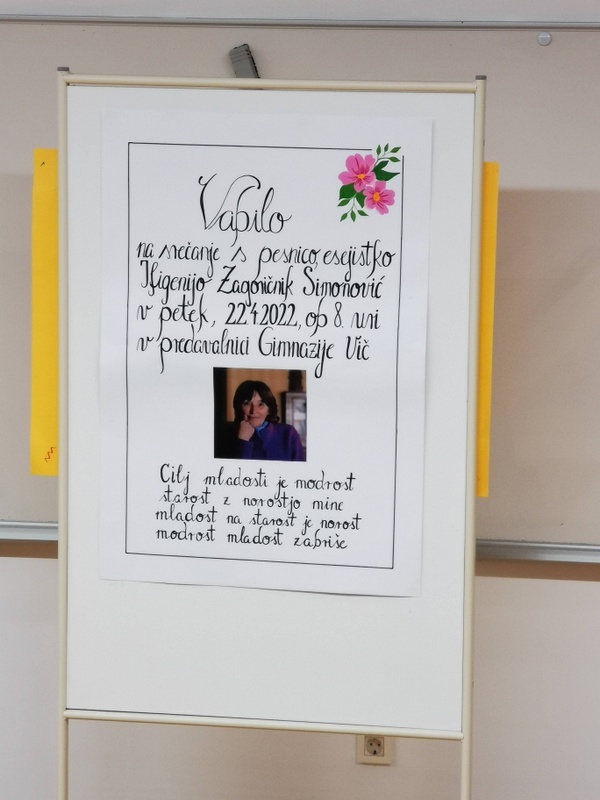 V petek, 22. 4. 2022, je bila gostja na Gimnaziji Vič Ifigenija Zagoričnik Simonović. Dijaki iz različnih razredov, ki jih zanima sodobna poezija in ustvarjanje v različnih umetnostih, so se z veseljem pridružili pogovoru, ki je potekal v predavalnici šole.