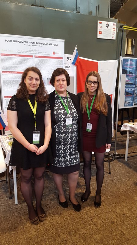 - Sara Jamnik, Helena Perić sta za nalogo Food Supplement from Pomegranate Juice prejeli zlato medaljo. Mentorice naloge so Alenka Mozer ter dr. Mihalea Skrt in dr. Nataša Poklar Ulrih z Biotehniške fakultete UL.