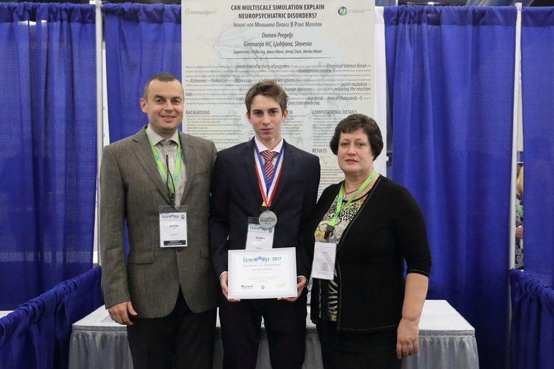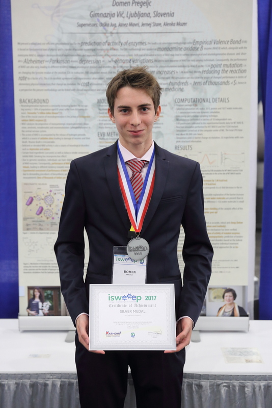 Na ISWEEEP olimpijado raziskovalnih projektov v Houston, Teksas, ZDA, je letos odpotoval Domen Pregeljc, dijak 3. a oddelka, v spremstvu svojih mentorjev dr. Jerneja Stareta s Kemijskega instituta in nase profesorice kemije Alenke Mozer; mentorja dr. Janez Mavri in Urska Jug sta za Domna navijala doma. V hudi konkurenci je Domen prejel srebrno medaljo v kategoriji Health and desease prevention. V finale tekmovanja se je uvrstilo 456 nalog, kar je tretjina vseh prijavljenih nalog. Sodelovali so tekmovalci iz 107 drzav (61 drzav sveta in 46 ameriskih zveznih drzav).