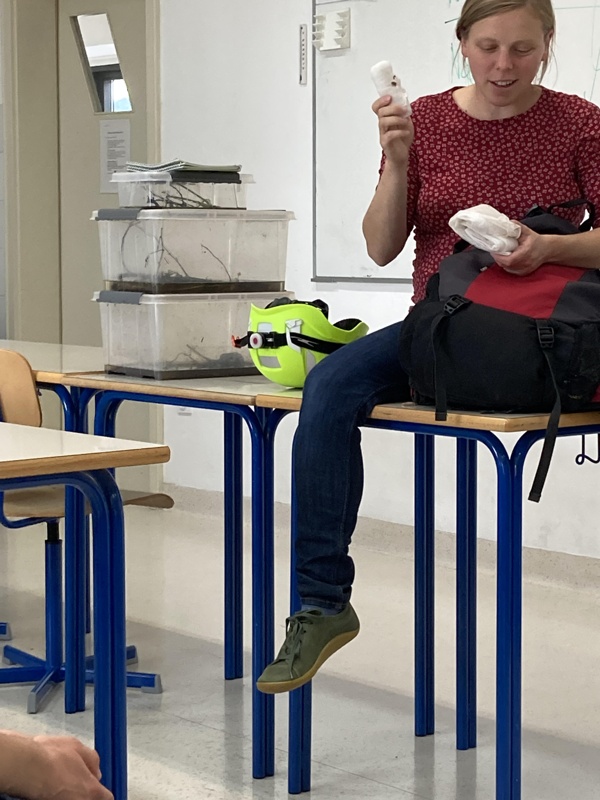 Naša bivša dijakinja in članica krožka GrinVič, dipl. biologinja Katarina nas je poučila o rokovanju z dvoživkami, povedala nam je, kako jih razlikujemo ter njihove značilnosti. Ker pa je sama tudi vodnica reševalnega psa, nam je predstavila tudi delo reševanja s pomočjo psa. Fantastično!