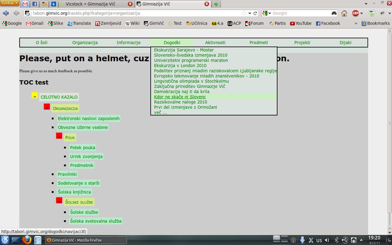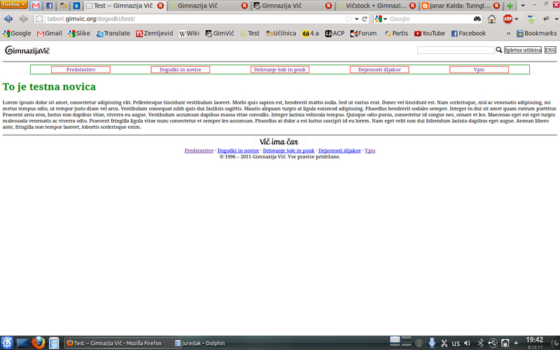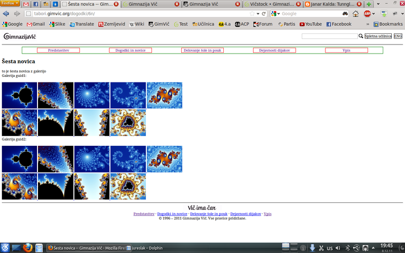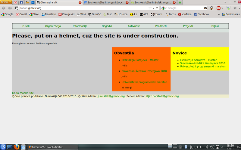Naša ekipa je dokončala celo stran brez grafične podobe in vsebine, naredili smo podporo za dodajanje novic, obvestil, dogodkov, ustvarili bazo vseh zaposlenih, dodali podporo za več galerij in se malo poigravali z JavaSriptom za lepe efekte. Aljaž Borštnik je poskrbel za administracijo strežnika in postavil stran na naslov test.gimvic.org. Jaz pa sem sprogramiral celotno stran, jo pretestiral, jo več kot 100-krat sesul in ponovno popravil in na koncu so vse stvari delale tako, kot morajo.