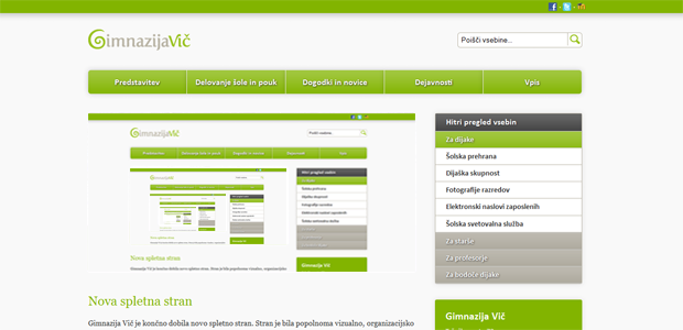 Upamo, da vam je stran všeč. Vanjo smo vsi skupaj vložili veliko dela, truda in volje, tako da menimo, da smo res naredili izdelek, ki je bil tega vreden. Želimo vam, da bi se na novi strani hitro znašli. Zasnovana je tako, da so vse vsebine čim hitreje dostopne preko menijev na desni. Na vrhu najdete glavne kategorije, na prvi strani na desni lahko uporabite hitri meni za najbolj pogosto obiskane vsebine, na sredini prve strani pa so pod tremi dogodki, ki jih želimo najbolj poudariti, novosti in obvestila. Popolnoma na vrhu strani najdete gumb, s katerim se lahko povežete z Gimnazijo Vič na Facebooku, Twitterju, poleg pa je tudi povezava do naše spletne učilnice.