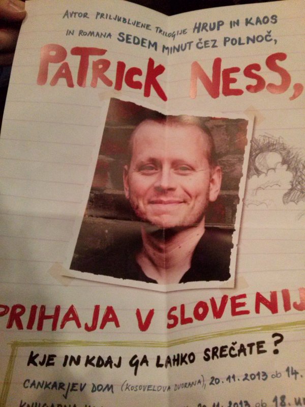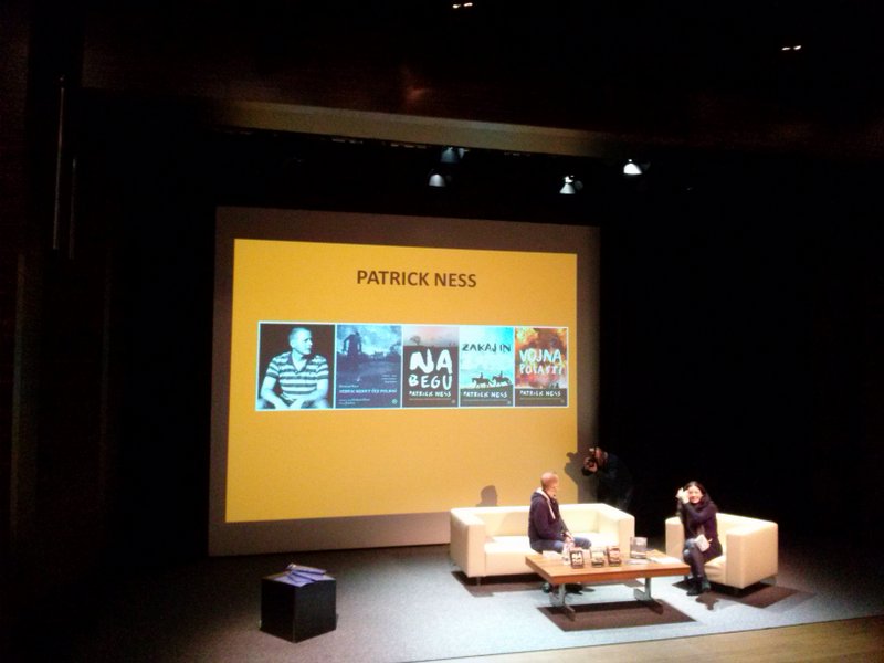 20. novembra 2013, smo se udeležili pogovora z enim najbolj priznanih avtorjev mladinske literature, Patrickom Nessom. Srečanje je potekalo v Cankarjevem domu, kjer so imeli učenci in dijaki možnost zastavljanja vprašanj, na katera je avtor odgovarjal z veliko mero domišljije in humorja. Patrick Ness je med drugim poudaril, kako pomembno je, da se mladi sami odločajo kakšno literaturo bodo brali, saj je bralni užitek neoddeljivi del ustvarjalnega bralnega procesa, ki nam prinaša zadovoljstvo. Močne vzpodbude so bili deležni tudi vsi, ki bi si želeli postati pisatelji.