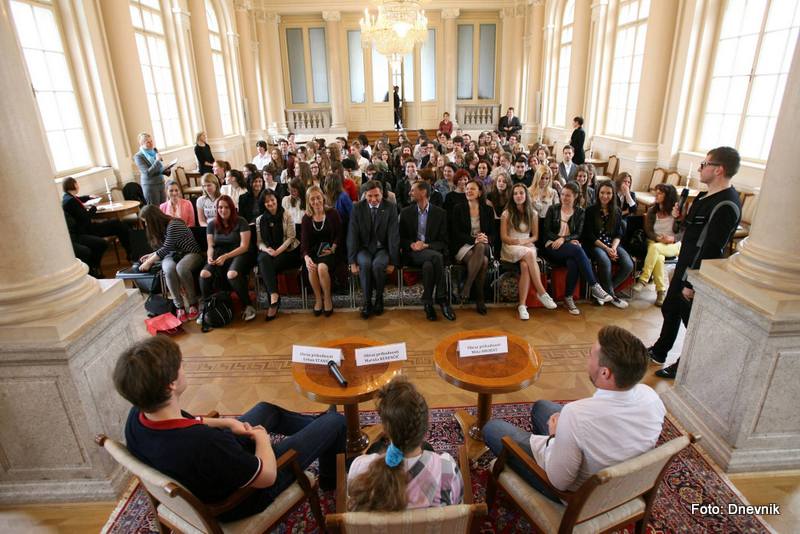Ta nas je sprejel v kristalni palači, v kateri so nam družbo delali tudi trije izjemni dijaki – Miha Hrobat, svetovni mladinski prvak v superveleslalomu, Urban Stanič, ki je na evrovizijskem tekmovanju mladih glasbenikov v Kölnu dosegel drugo mesto, in Maruša Kerenčnik, dobitnica bronaste medalje na mladinski naravoslovni olimpijadi. Po uvodnem govoru predsednika države, je pogovor v svoje roke prevzel že prej omenjeni voditelj in vsem trem zastavil nekaj vprašanj, nekaj pa so jih na koncu dodali še mladi novinarji.