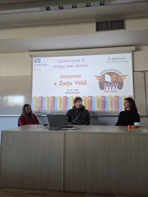 10. 12. 2025 smo na Gimnaziji Vič gostili avtorico, prevajalko in raziskovalko dr. Zarjo Vršič. V sklopu Erasmus+ projekta pri skupini Zgodbarjenje dijaki raziskujejo slovensko in češko književnost, se ukvarjajo z medumetnostnim prenosom in predelavo kratkih zgodb, tako pa skozi literarno ustvarjanje spodbujajo strpnost, medkulturni dialog in ustvarjalnost. Pogovoru so se pridružili še dijaki skupine Knjiga brez platnic, ki so razmišljali o tem, kako zmore literatura nagovarjati, razgaljati in preoblikovati stereotipe. S srečanjem smo hkrati obeležili tudi evropski dan avtorjev v okviru mednarodnega projekta Read for Real, s čimer uresničujemo pomembne Unesco cilje na področju bralne pismenosti, kulturne raznolikosti in mednarodnega povezovanja.