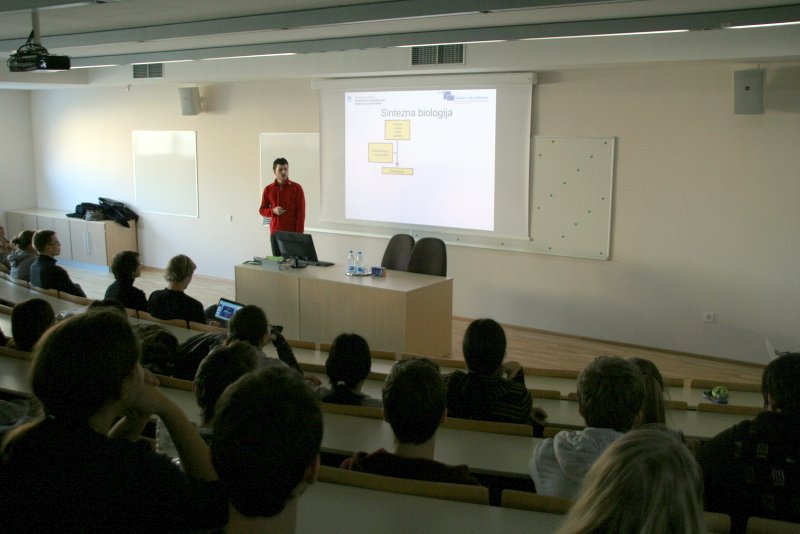 Obiskala nas je ekipa, ki se je letos udeležila mednarodnega tekmovanja iGEM (International Genetically Engineered Machine competition). Sestavljala sta jo tudi bivša dijaka naše šole Boštjan Pirš in Miha Jerala, ki sta študenta medicine. V ekipi so bili poleg študentov medicine tudi študenti biotehnologije, biokemije, računalništva in informatike.