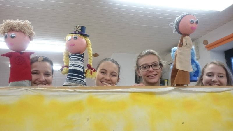V četrtek, 15. oktobra 2015, je skupina dijakinj iz 4. f obiskala vrtec Moj Moj in za najmlajše uprizorila lutkovno predstavo. Za glasbeno spremljavo je poskrbel Jakob Barbo iz 4. b. Kljub dežju, ki nam je pri prevozu platna povzročal nemalo težav, in zapletom z instrumenti v vrtcu smo veseli, da smo dogodek uspeli izpeljati. Malčkom smo popestrili dan, saj so predstavo z zanimanjem spremljali, za nas pa je bilo druženje z njimi lepa in prijetna izkušnja.