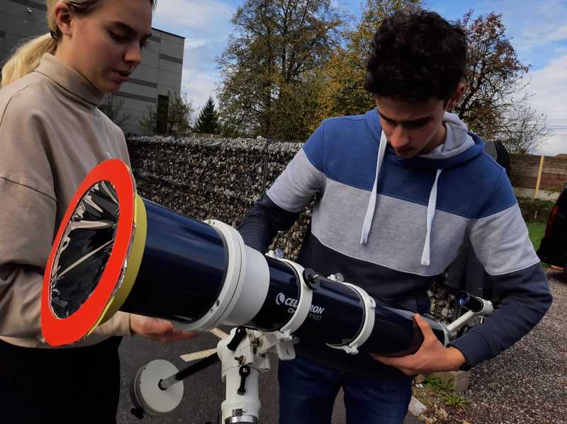 Vreme ni bilo najbolj ugodno za opazovanje, saj smo se zbudili v deževno jutro. Kljub temu smo v upanju, da morda še vseeno kaj vidimo, pred šolo postavili teleskope. Te smo za opazovanje Sonca prilagodili, tako da smo jih opremili z doma narejenimi filtri, ki blokirajo del svetlobe, saj Sonca ne smemo opazovati neposredno s prostim očesom. Težavo so nam predstavljali oblaki, ki so doberšen del časa zakrivali pogled. Slabemu vremenu navkljub smo tekom mrka uspeli posneti nekaj fotografij, Sonce pa smo poleg uporabe teleskopa (črno obarvana fotografija) opazovali tudi na projekciji na papir (modro obarvana fotografija) in skozi zaščitna stekelca (zeleno obarvana fotografija).