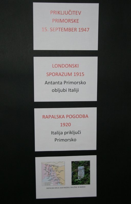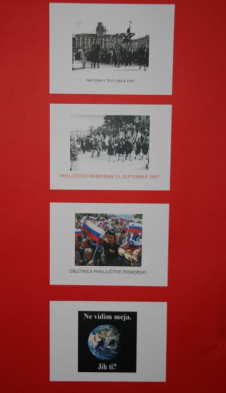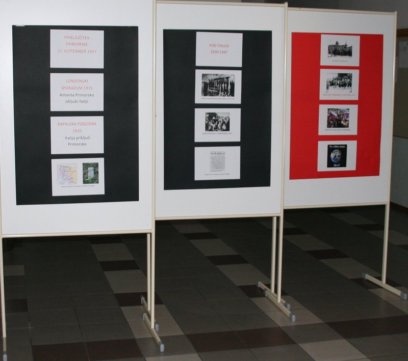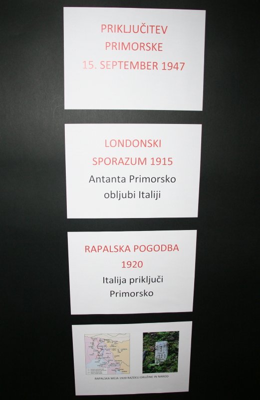 S priložnostno razstavo smo na šoli obeležili spomin na priključitev Primorske k matični državi pred 66. leti, ko so primorski Slovenci ponovno združeni po 27 letih. Z Rapalsko pogodbo je Italija leta 1920 dobila »plačilo« za vključitev v 1. svetovno vojno na strani antante . Delitev družin, propad kmetij, izseljevanje in raznarodovalna politika so zaznamovale primorske Slovence do konca druge svetovne vojne, po vojni pa je še enkrat postala žrtev politike velesil, ki so barantale s tujimi ozemlji. Leta 1947 so Primorci končno dobili svoj dom tam, kjer so želeli sami. Med drugimi Slovenci.