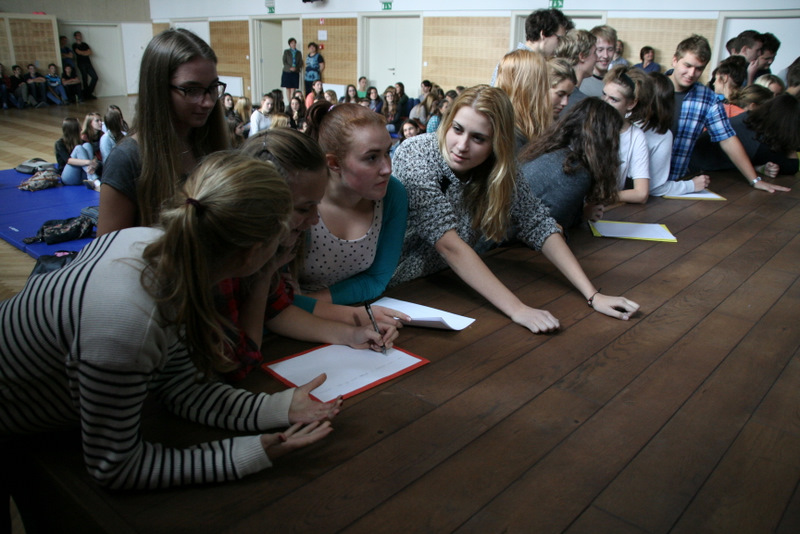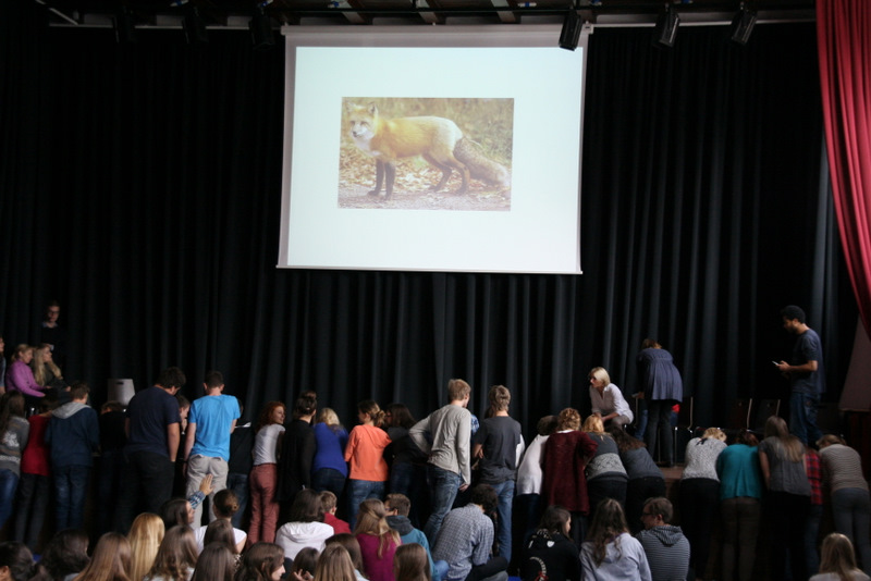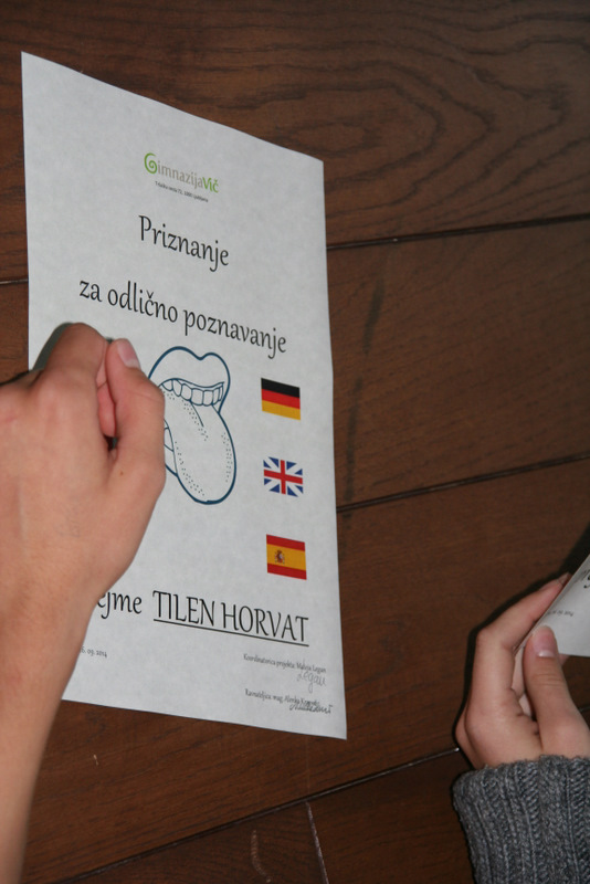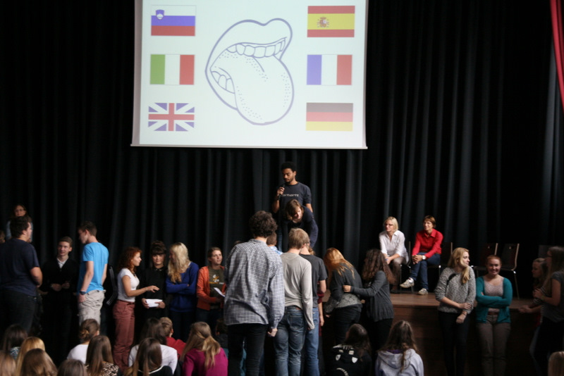Na Evropski dan jezikov, v petek, 26. 09. 2014, smo na naši šoli zaokrožili celoten teden in med glavnim odmorom pripravili zaključno prireditev. Najprej smo spregovorili nekaj besed o lepoti jezika; prebrali Pavčkovega Popotnika in njegova prevoda v angleščino in španščino, nato pa prisluhnili enakim frazemom v jezikih, ki se jih učimo na šoli. Za konec pa smo pod vodstvom prof. Kleina imeli še tekmovanje v poznavanju frazemov in pregovorov, povezanih z različnimi živalmi. Tekmovali smo v šestih skupinah, in sicer slovenski, angleški, francoski, italijanski, nemški in španski ter poizkušali najti čim več pravilnih frazemov/pregovorov povezanih z določeno živaljo. Po 6-ih krogih je slavila slovenska ekipa, drugo mesto je osvojila angleška ekipa, tretje mesto pa španska skupina.