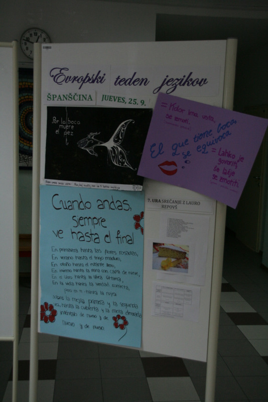 V četrtek smo prisluhnili španski glasbi, uživali v španski hrani in se ukvarjali tako s prevajanjem Pavčkove pesmi kot z iskanjem frazemov in pregovorov v španščini, ki smo jih kasneje tudi narisali. Razveselil nas je obisk naše bivše dijakinje Laure Repovš, ki nam je povedala nekaj več o študiju španščine.