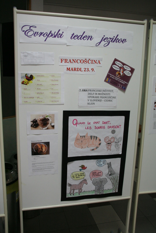 V torek smo obeležili dva jezika, francoščino in italijanščino – francoska glasba zjutraj in italijanska med glavnim odmorom; italijanska hrana za malico in francosko kosilo, pri rednih urah pa predvsem iskanje frazemov v francoščini in italijanščini, ki so podobni slovenskim. Nekaj pregovorov smo tudi narisali in jih obesili v avlo. Za konec dneva pa je sledilo še predavanje prof. Cedrica Kleina o Francoskem inštitutu ter možnostih uporabe francoščine v Sloveniji.