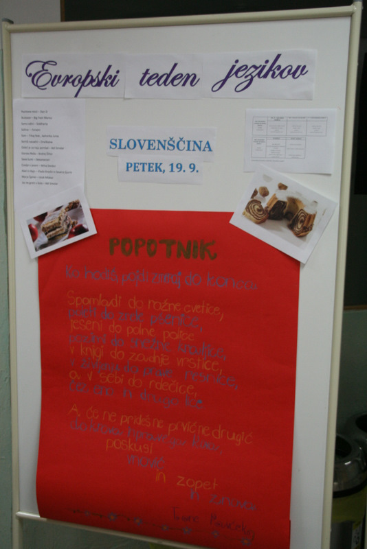 V petek smo tako prisluhnili slovenski glasbi, poskusili nekaj tipičnih slovenskih jedi, prebrali Pavčkovo pesem Popotnik in se ukvarjali z njeno interpretacijo, analizirali frazeme in pregovore ter posebno pozornost namenili pogovoru o pomembnosti ohranjanja slovenskega jezika. Obiskali so nas gosti z Univerze v Katovicah, ki so nam predstavili delo Centra za slovenščino kot tuji jezik, ter pesnik in dramski igralec Tone Kuntner.