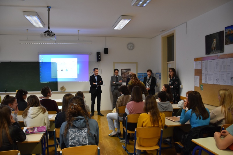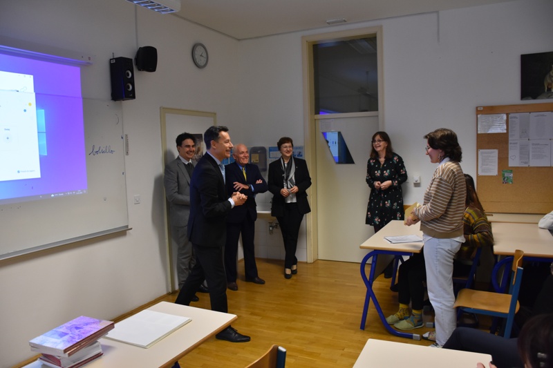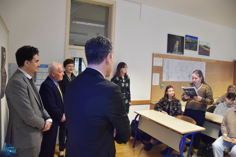 Po uvodnem pogovoru z ravnateljico so obiskali dijake 2. e oddelka, ki so se jim pridružile tudi maturantke, in profesorico Miriam Jereb Batagelj pri uri španščine. Po pozdravu maturantk so prebrali še dve pesmi Gabriele Mistral, čilenske nobelove nagrajenke.