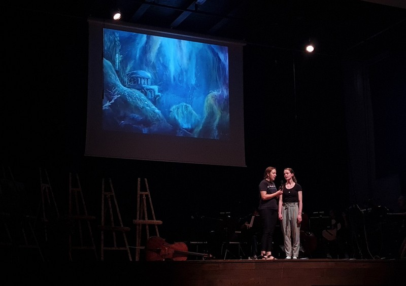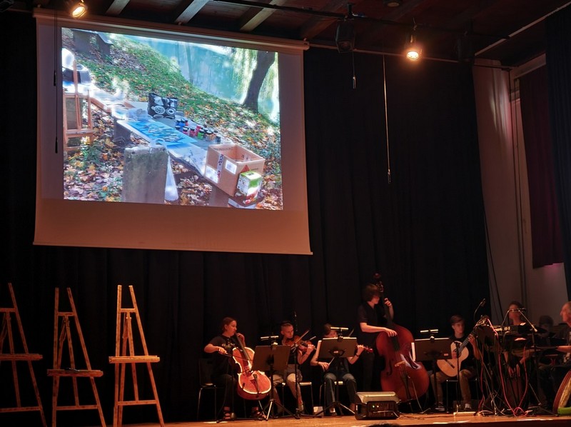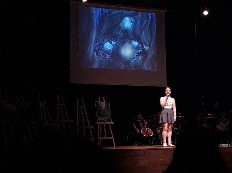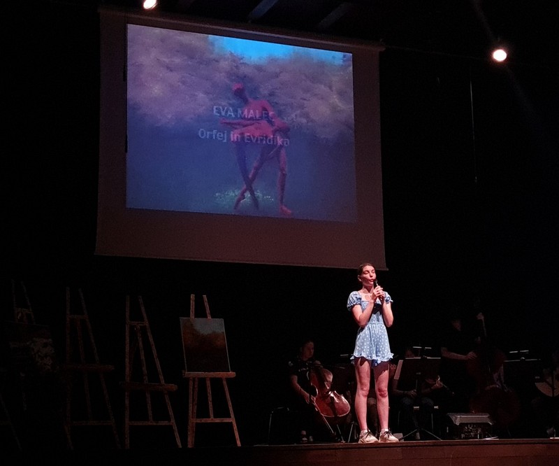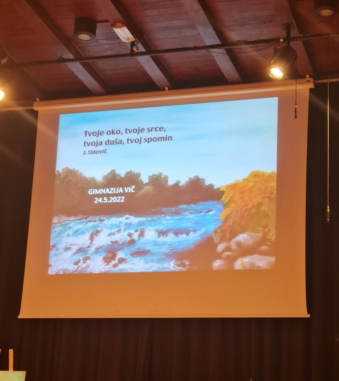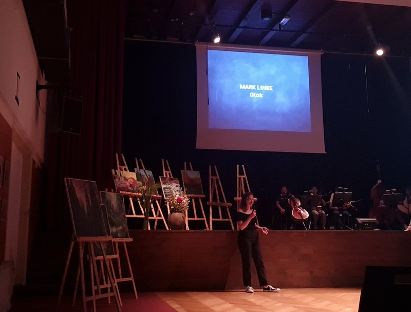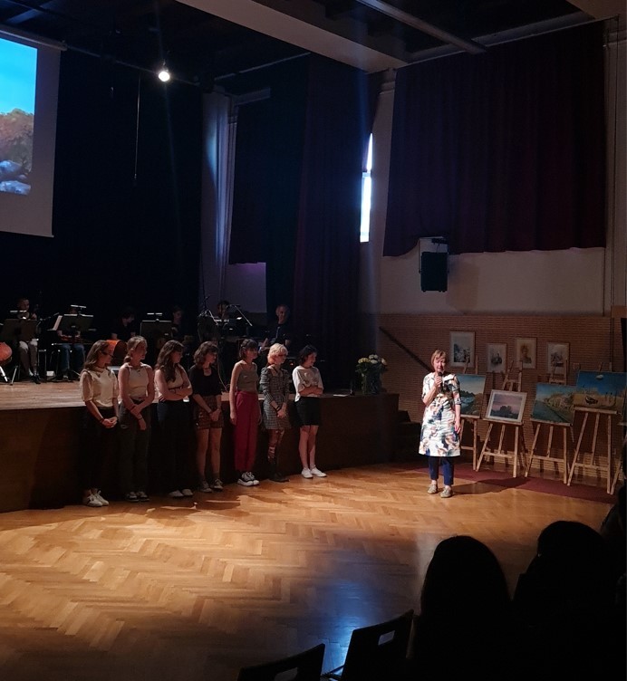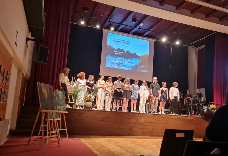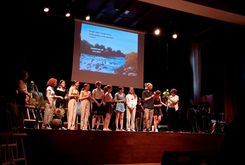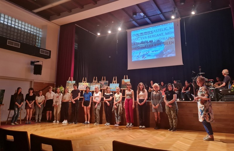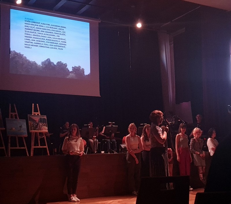 The majority of the paintings were put on display in the school hall, where the main presentation also took place, while other pieces were shown in different places around the school building. The project was organised by the club's mentor, Ms. Jana Ozimek, one of the Slovene teachers at our school. This was an especially important event as it is the last one that she will organise before her retirement.