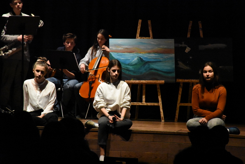 On Monday 11th February 2019, a group of Gimnazija Vič students put on a celebratory play titled “V daljavi slišim teči reko v reki” (In the distance I hear a river flowing within a river). This short celebration marked the official opening of the school’s art group’s new exhibition.