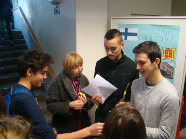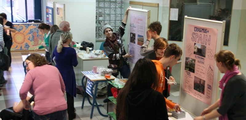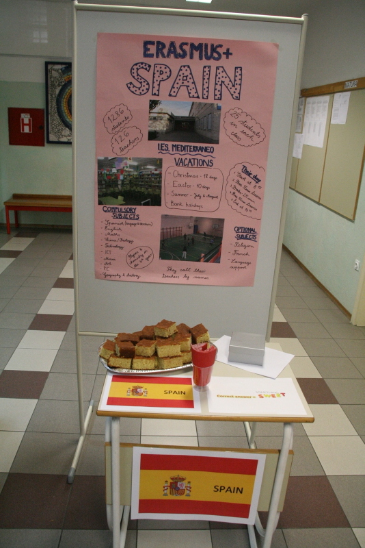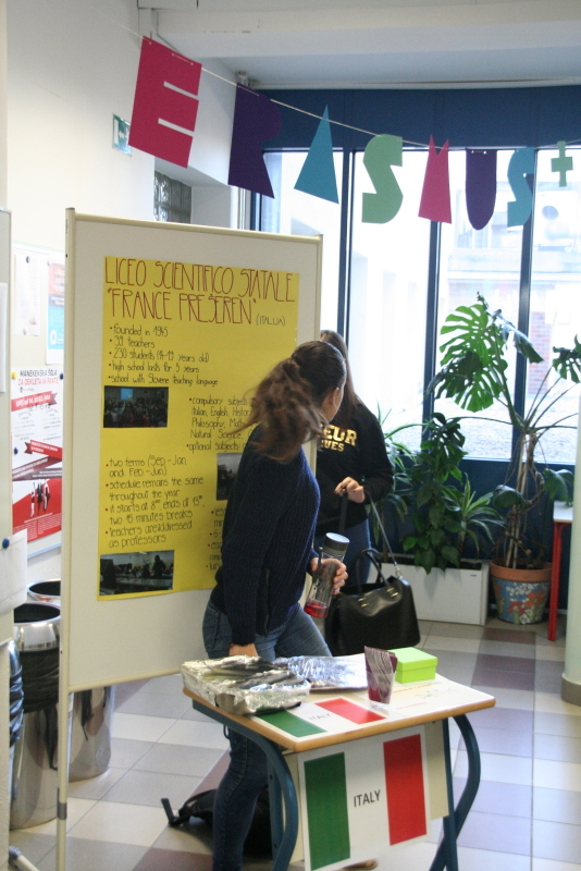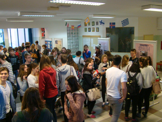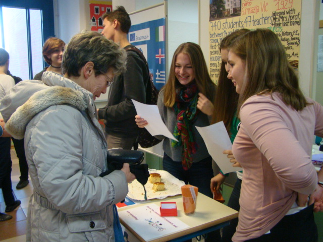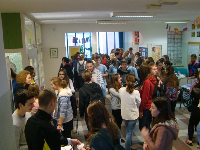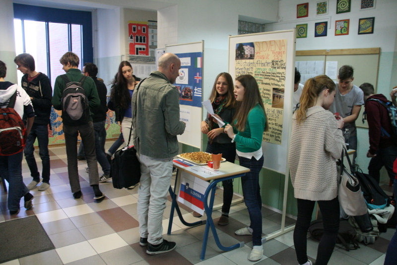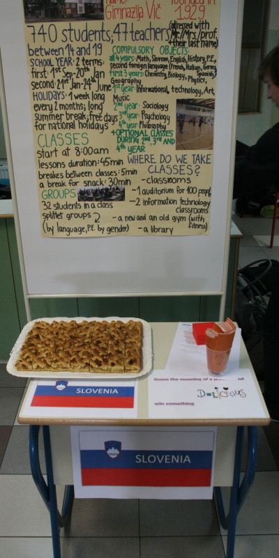 Odločili smo se, da se organizacije lotimo nekoliko drugače – želeli smo vključiti mimoidoče. Pripravili smo 6 plakatov z informacijami o sodelujočih državah, izobesili zastave držav in logotipe projekta ter pripravili kviz o vsaki državi. V petek med glavnim odmorom so se mimoidoči ustavili pri kateremkoli panoju, odgovorili pravilno na zastavljeno vprašanje in si s tem prislužili nekaj sladkega – pripravili smo jim nekaj tipičnih sladic iz posameznih držav. Dijaki 2. D smo se od ostalih dijakov ločili s pomočjo priponk, ki smo jih pripravili zgolj za to priložnost. Glede na odzive tako dijakov kot profesorjev menimo, da je bil dogodek zelo uspešen; pa tudi mi, kot organizatorji, smo se zabavali. O dogodku smo posneli kratek video, ki si ga lahko ogledate na povezavi: