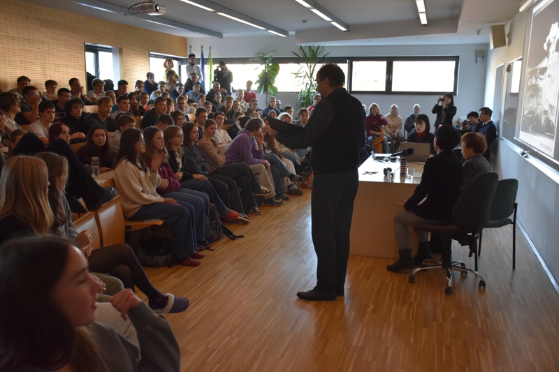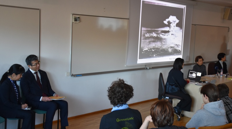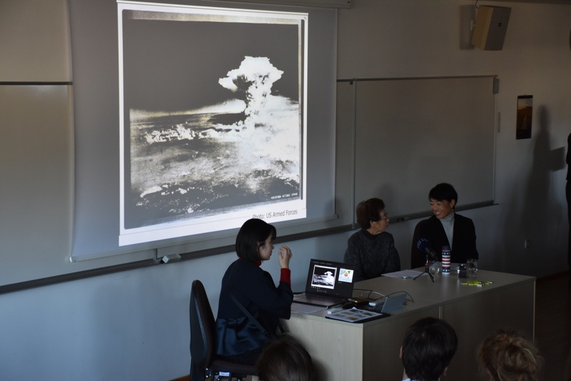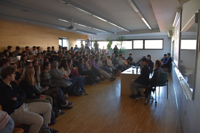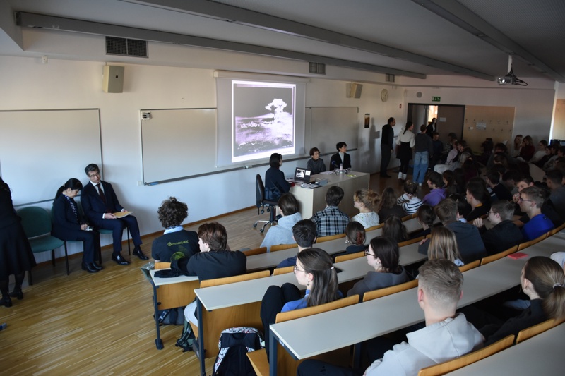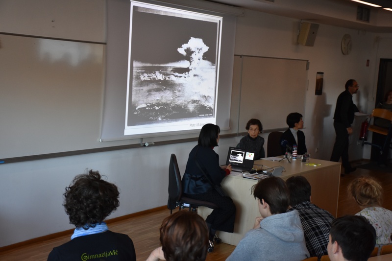 V nabito polni predavalnici je ga. Kasaoka ob sodelovanju prevajalke in predstavnikov Spominskega muzeja miru v Hirošimi in Centra za mir Univerze v Hirošimi dijakom predstavila svoje izkušnje in občutke po eksploziji atomske bombe. Od dogodka, ki je pretresel svet, je minilo skorajda 80 let, a zanimivo in pretresljivo predavanje nas je opomnilo, kako pogovor o miru ob trenutnem dogajanju v svetu ne bi moral biti bolj relevanten ter kako ključno je gojiti mir v svetovni skupnosti, če želimo človekove pravice tudi uresničevati.