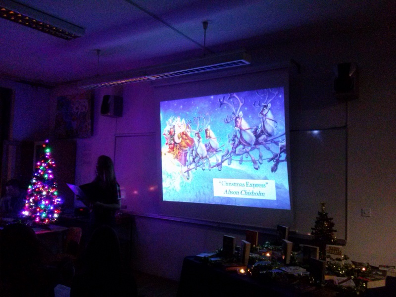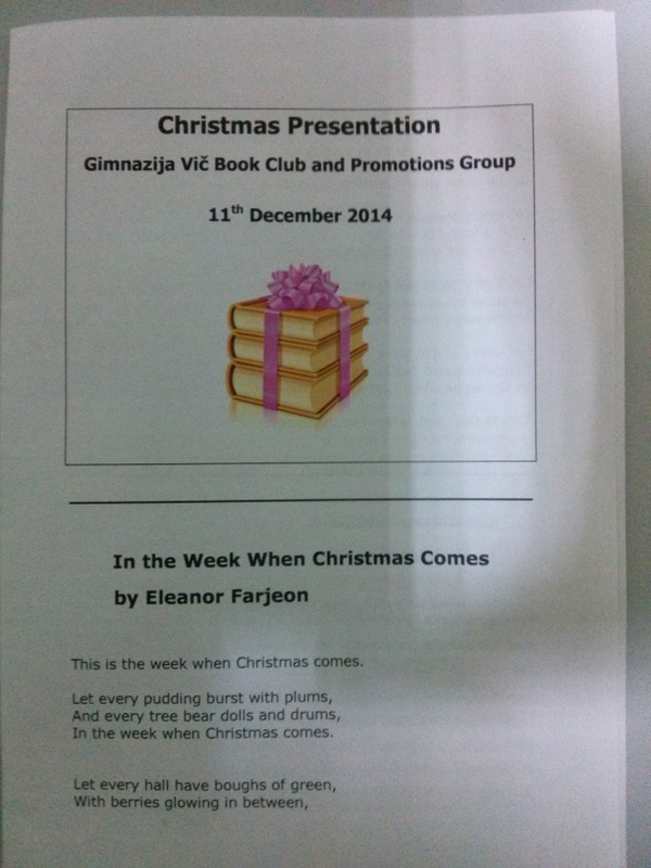 V uvodnem delu smo prisluhnili recitacijam tradicionalnih angleških božičnih pesmi ter interpretacijam odlomkov iz božičnih zgodb. Nato smo vstopili v pravljični svet Božička; v nadaljevanju pa so sledile predstavitve najbolj branih angleških knjig v letu 2014, med katerimi jih je kar lepo število na voljo tudi v naši šolski knjižnici.