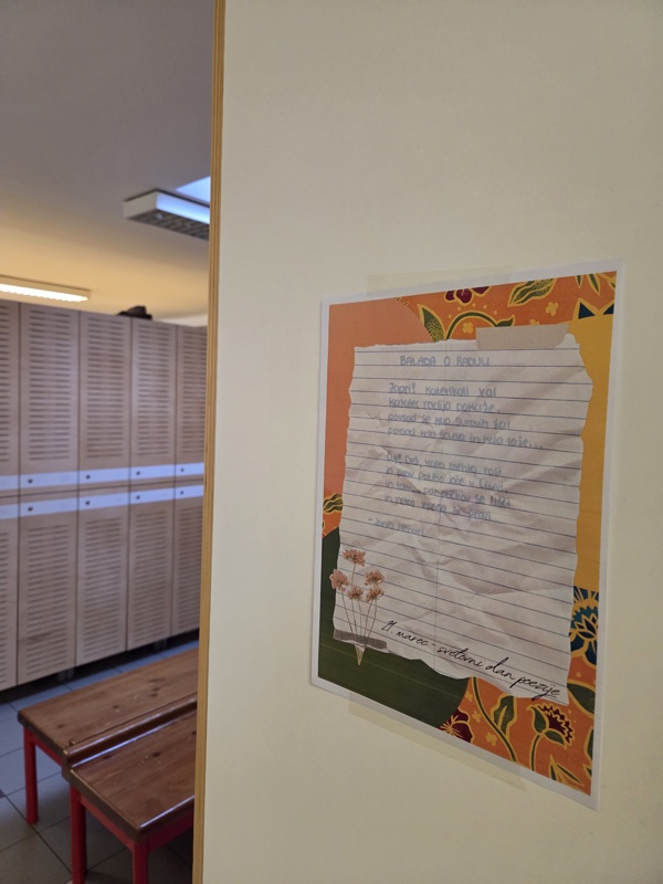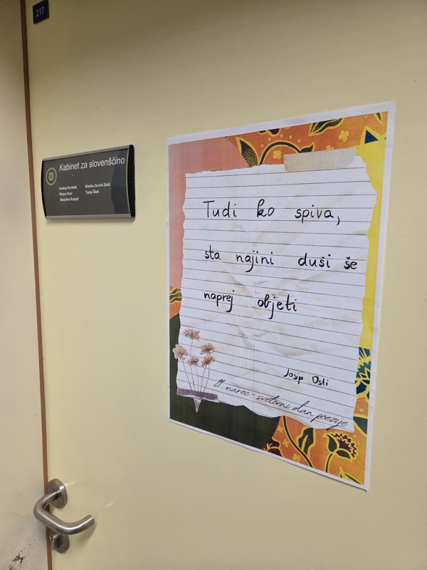 Ob svetovnem dnevu poezije, ki ga praznujemo 21. 3., so dijaki 2.a razreda preostali šoli, dijakom in učiteljem podarili pesmi slovenskih avtorjev, ki so jih napisali na roko. Med glavnim odmorom je na šolskem radiu potekalo branje poezije v jezikih, ki se jih učimo na Gimnaziji Vič.