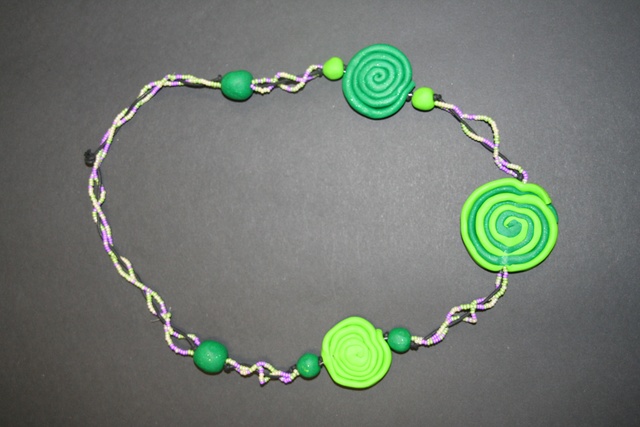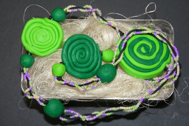 Izbrali smo tudi najlepše viške kose nakita. Nagradili smo komplet orglice, uhanov in prstana oranžno-rjave kombinacije iz filca ter perlic Ane Johane Scholten iz 1. D-oddelka. Prav tako nas je navdušila Mateja Gladek iz 2. B-oddelka z ogrlico iz fimo mase ter perl. Temno zelena barva simbolizira profesorje, svetla pa dijake, glavni obesek (ki je kombinacija obeh barv) pa predstavlja vez med dijaki in profesorji, ki se v štirih letih zgradi in skupaj raste.