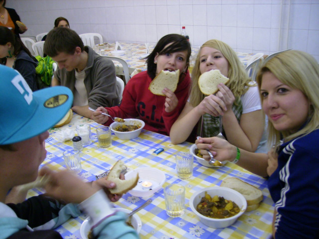 Slovenske ceste so razkopane, zato smo se malo dalje zadržali na njih, po prestopu meje pa je šlo vse gladko. Pred Budimpešto nas je dočakal oblak vulkanskega pepela in nas malo posul z dežjem, a se je do mesta že zvedrilo. Na šoli so nas težko pričakovali (nikjer nikogar), ko smo se končno našli je sledilo veselo srečanje. Po dobri madžarski navadi seveda spet z veliko hrane (ki smo jo imeli še s seboj, saj so nas naši kuharji – hvala – dobro opremili za pot.) Nato smo se razšli – vsak na svoj (novi) dom, kjer nas je spet čakala – hrana: Gostitelji – tako dijaki kot njihovi starši so izredno prijazni in gostoljubni, le težko se je pogovarjati, saj je njihovo znanje angleščine bolj šibko. Dobro, da imamo roke in noge, nekaj pa je gotovo – lačni ne bomo.