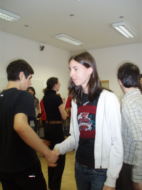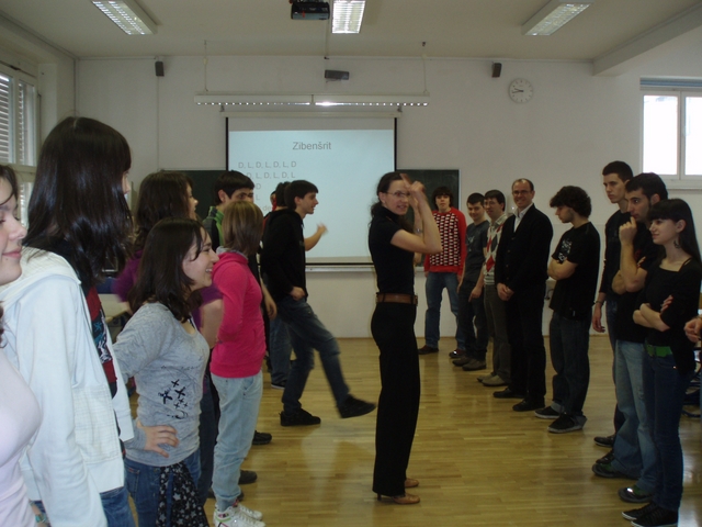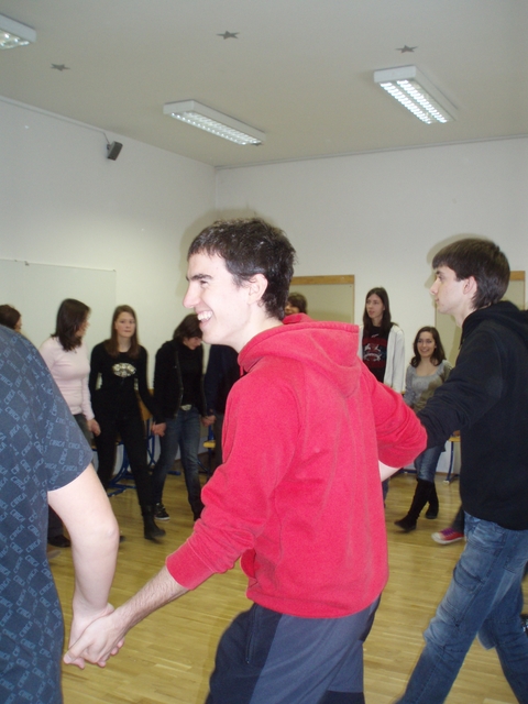 Naslednji dan smo se ob devetih zbrali v šoli, kjer nas je profesorica glasbe Marija Mihevc naučila nekaj slovenski pa tudi tujih skupinskih plesov. Mislim, da nam je šlo prav dobro od nog.
