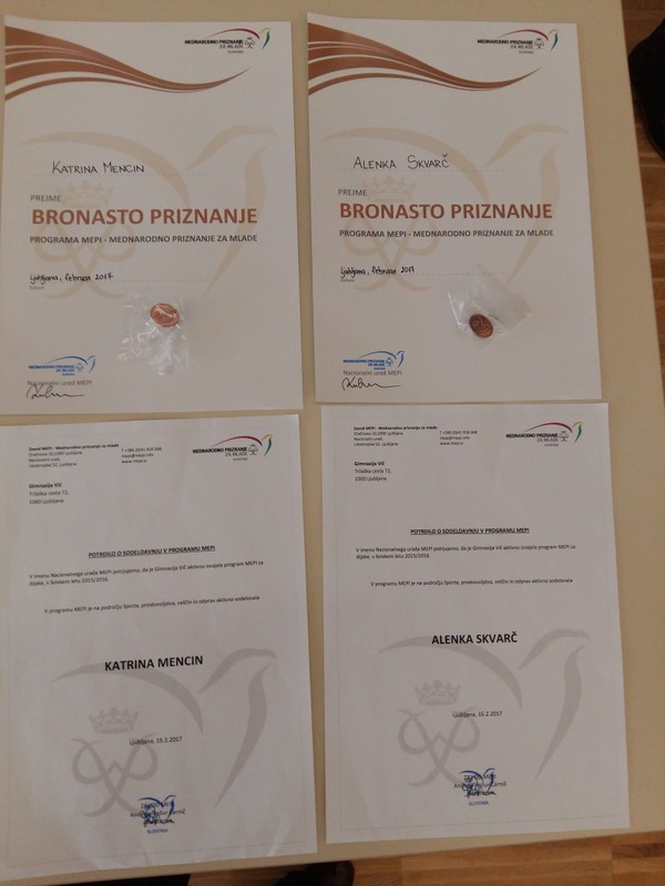 V četrtek, 23.2.2017, smo na Gimnaziji Vič slovesno podelili prvi dve bronasti MEPI priznanji. Prejemnici sta naši dijakinji, Katrina Mencin in Alenka Škvarč.