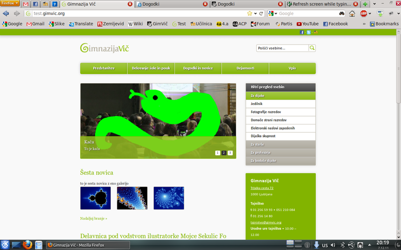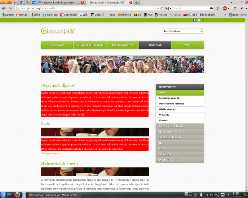 Nato je prof. Bajec pripeljal skupino nadebudnih fazanov, ki sem jih naučil, kako se dela na novi strani. Zelo zagnano so se lotili prenašanja vsebine skupaj z ženskim delom ekipe, Ines Meršak, ki je poleg vsebine skrbela tudi za fotografije na novi strani. Tudi sam sem prenesel veliko vsebine in tako ugotovil, da je kar nekaj manjka. S prof. Bajcem sva se tako oglasila pri vseh učiteljih in drugih delavcih šole, ki bi lahko še prispevali svežo vsebino za novo spletno stran. Trajalo je kar nekaj tednov, da smo večino vsebine prenesli, posodobili in ogromno tudi dopisali. Naša delovna ekipa je imela dvakrat na teden redne sestanke v informatiki, da smo lahko sproti naredili vse potrebno. Sledil je še zadnji teden lepotnih popravkov, lektoriranja s strani prof. Mirjam Šemrov in pregleda s strani ravnateljice, in tako sem lahko 22. 12. 2011 na enem izmed naših sestankov z velikim veseljem pritisnil Enter. Od takrat naprej vam ponosno predstavljamo novo spletno stran Gimnazije Vič.