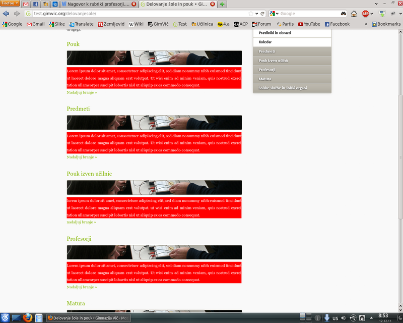 Vmes pa je šla izdelava projekta naprej. Tako sta oblikovalca konec oktobra poslala dizajn strani, ki smo ga na hitro implementirali v obstoječo infrastrukturo. S tem, ko je stran postala precej bolj všečna na pogled, pa smo se lahko oglasili pri vodstvu šole in se pogovorili o vsebinski prenovi. S prof. Bajcem in pomočnico ravnateljice prof. Vanjo Špelko smo imeli veliko sestankov, da smo ugotovili, kaj se lahko kam premesti, in da smo prav vse vsebine na strani uvrstili v pravo kategorijo; seveda smo si pomagali z osnovno strukturo, ki smo jo že prej dogovorili z oblikovalcema. V spodnji galeriji pa si lahko ogledate, kako se je izgled strani spreminjal skozi celotni postopek izdelave.