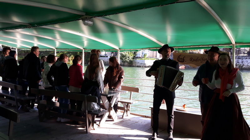 V Novomeškem muzeju smo si ogledali arheološko zbirko ter poslušali zanimivo predavanje v Jakčevem domu o akterjih novomeške pomladi leta 1920. Predavanje so popestrili naši dijaki z glasbenimi točkami. Posebno doživetje pa je bila vožnja s splavom, na katerem smo slišali zgodbo o Primičevi Juliji, ki je tu živela v zadnjem obdobju svojega življenja in je tu tudi pokopana.