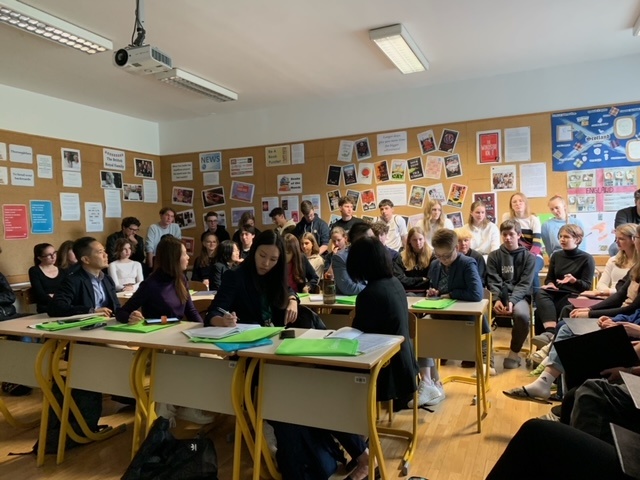 Goste je najprej skupina dijakov popeljala na ogled šole, nato pa so se udeležili predstavitve, ki so jo izvedli člani angleške promocijske skupine. Poleg osnovnih informacij o Sloveniji so se podučili o slovenskem izobraževalnem sistemu, seznanili pa so se tudi z glavnimi poudarki in načinom vodenja Gimnazije Vič ter z bogato ponudbo obšolskih dejavnosti, ki dijakom omogočajo razvijanje njihovih zanimanj in talentov. Predstavitvi je nato sledil živahen razgovor z večjo skupino dijakov, na podlagi katerega so gostje izvedeli več o tem, kako se najstniki pri nas spopadajo s stresom, kakšnih izboljšav obstoječega šolskega sistema si želijo ter kakšna pričakovanja imajo glede osebne in družbene prihodnosti.