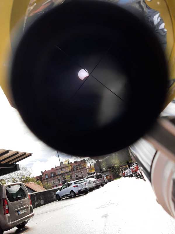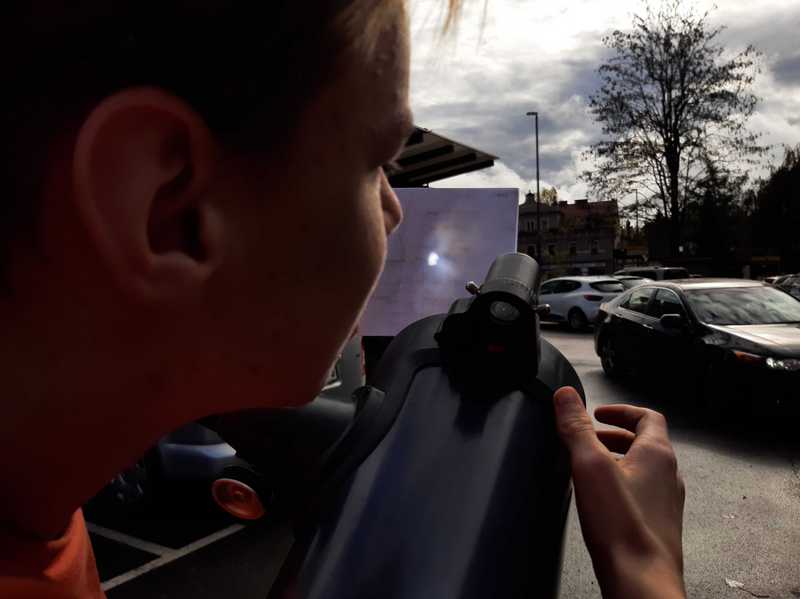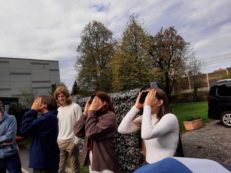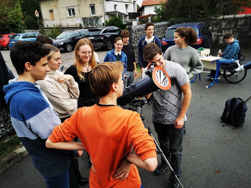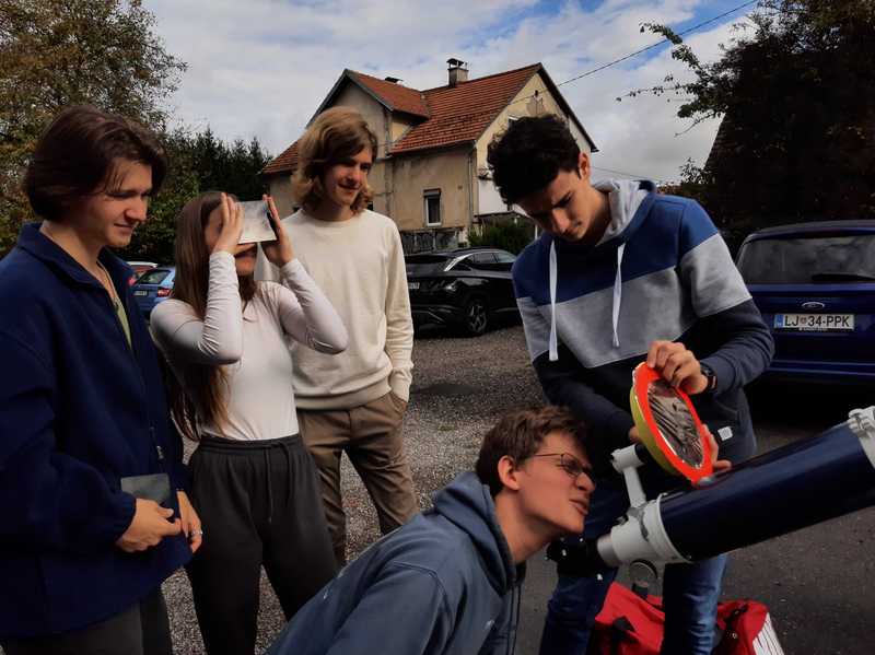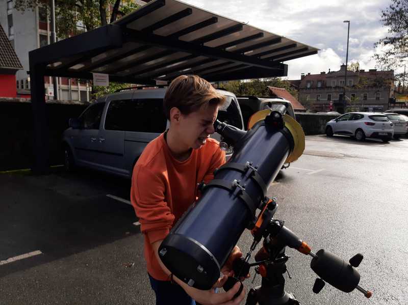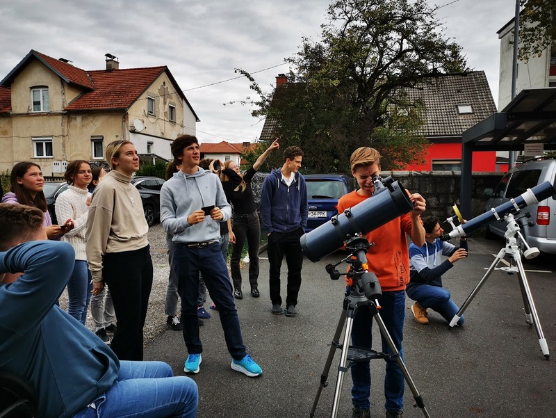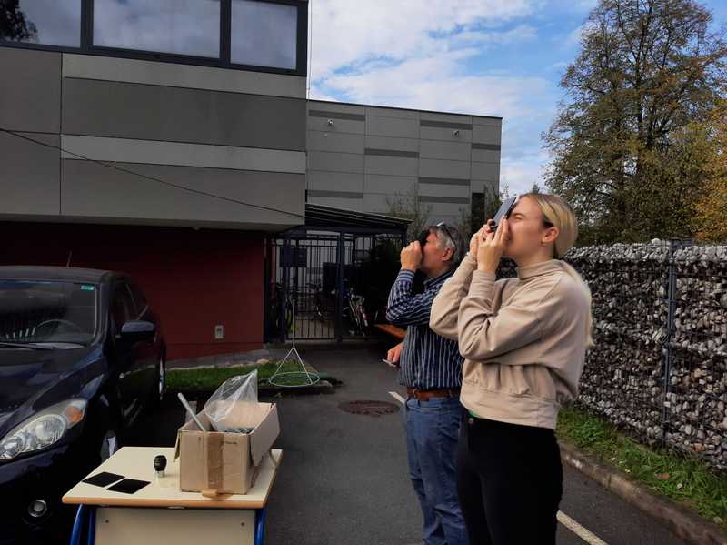 Vreme ni bilo najbolj ugodno za opazovanje, saj smo se zbudili v deževno jutro. Kljub temu smo v upanju, da morda še vseeno kaj vidimo, pred šolo postavili teleskope. Te smo za opazovanje Sonca prilagodili, tako da smo jih opremili z doma narejenimi filtri, ki blokirajo del svetlobe, saj Sonca ne smemo opazovati neposredno s prostim očesom. Težavo so nam predstavljali oblaki, ki so doberšen del časa zakrivali pogled. Slabemu vremenu navkljub smo tekom mrka uspeli posneti nekaj fotografij, Sonce pa smo poleg uporabe teleskopa (črno obarvana fotografija) opazovali tudi na projekciji na papir (modro obarvana fotografija) in skozi zaščitna stekelca (zeleno obarvana fotografija).