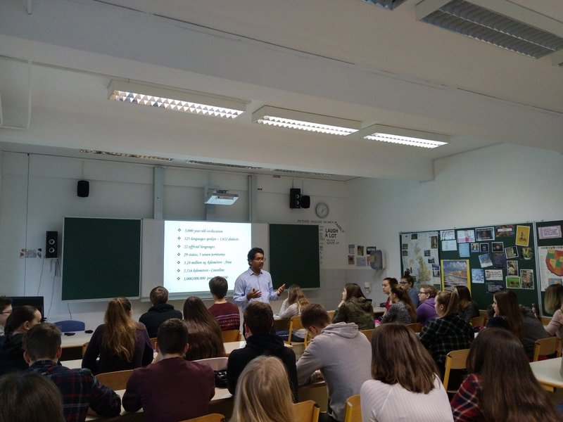V četrtek, 29. 3. 2018, je Gimnazijo Vič obiskal Pawan Kumar Singh, podiplomski študent agronomije iz Indije. Obisk je potekal v okviru projekta Svet v učilnici, ki ga vodi CMEPIUS. G. Singh je sodeloval pri dveh urah angleščine v 2. a in 2. e razredu. Dijakom je predstavil svojo državo. Poudaril je raznolikost Indije, govoril pa je tudi o indijski zgodovini in književnosti, jogi, indijskih običajih ter o znamenitih osebnosti in krajih svoje države.