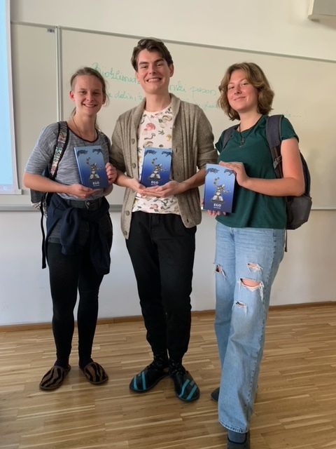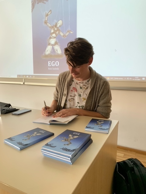 V torek, 11. oktobra, sem v šolski predavalnici predstavil svojo angleško-slovensko pesniško zbirko z naslovom Ego, ki je izšla konec lanskega šolskega leta. Mentorja projekta sta bila Blanka Klobučar in Tim Gallagher, ilustracije pa je prispevala naša zdaj že bivša dijakinja Maja Puklavec.