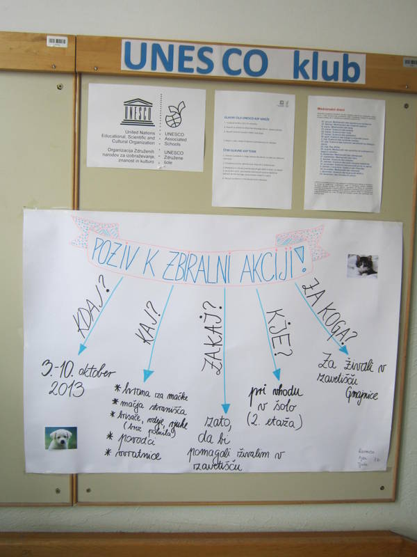 Na Gimnaziji Vič so dijaki 1. B razreda v okviru UNESCO kluba pripravili različne dejavnosti. V tednu od 3. do 10. oktobra je na šoli potekala zbiralna akcija materialnih donacij za potrebe zavetišča Gmajnice. Ob vstopu v stavbo šole so bili izobešeni plakati, ki so opozarjali na varovanje ogroženih vrst živali, na human odnos do živali vseh vrst, saj so tudi živali čuteča bitja. Dijake in profesorje so povabili k oblikovanju razstave fotografij domačih ljubljenčkov, ki so jih lahko pritrdili na tablo v avli šole.