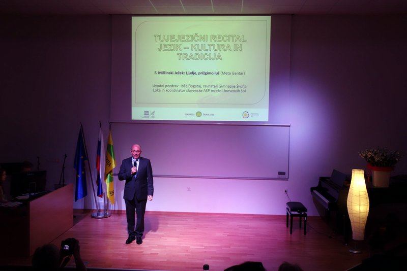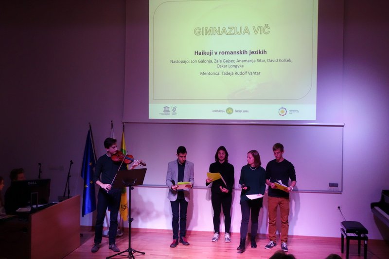 V petek, 6. novembra 2015, so naši dijaki Jon Galonja, Anamarija Sitar, Zala Gajser, David Kolšek in Oskar Longyka sodelovali na Unescovem Tujejezičnem recitalu Jezik – kultura in tradicija, ki ga že nekaj let kot nacionalni UNESCO projekt organizira Gimnazija Škofja Loka. Naši dijaki so sodelovali z odlično interpretacijo haikujev v romanskih jezikih, ki jim je dodatno življenje vdihnil strasten nastop violinista Oskarja Longyke.
