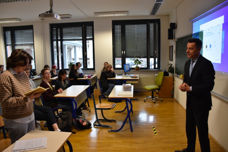 Po uvodnem pogovoru z ravnateljico so obiskali dijake 2. e oddelka, ki so se jim pridružile tudi maturantke, in profesorico Miriam Jereb Batagelj pri uri španščine. Po pozdravu maturantk so prebrali še dve pesmi Gabriele Mistral, čilenske nobelove nagrajenke.